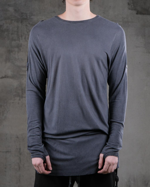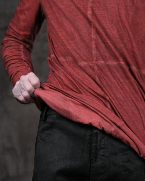 Каждое изделие создается как самостоятельный объект: многослойные окрашивания, холодные пигментные обработки и ручные покрытия формируют живую, неоднородную поверхность. Трикотаж и джерси проходят сложнейший цикл трансформаций - от окрашивания до финальной ручной доработки с эффектами состаривания и выразительной вышивкой. Эти элементы не просто декоративны, они подчеркивают анатомичность вещей, их связь с телом и движением.