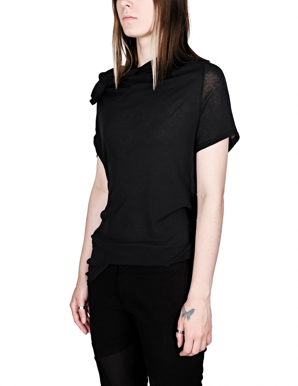 WOMEN'S ASYMMETRIC DRAPE T-SHIRT IN BLACK COLOR FROM DICHOTOMY LIMITED COLLECTION. CRAFTED WITH A TWISTED DRAPE STRETCHED FROM SHOULDERS TO THE BACK.