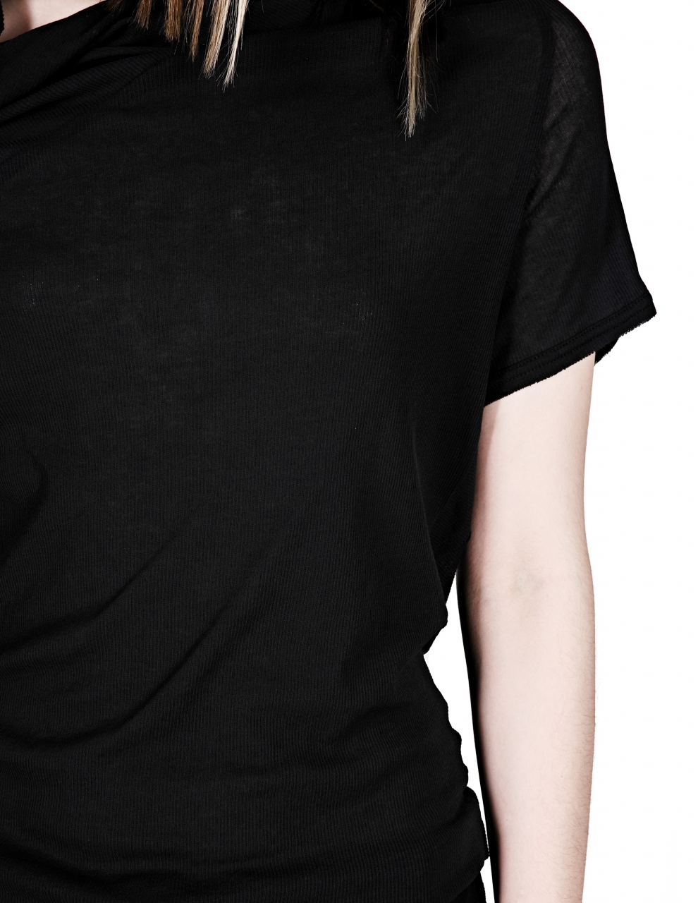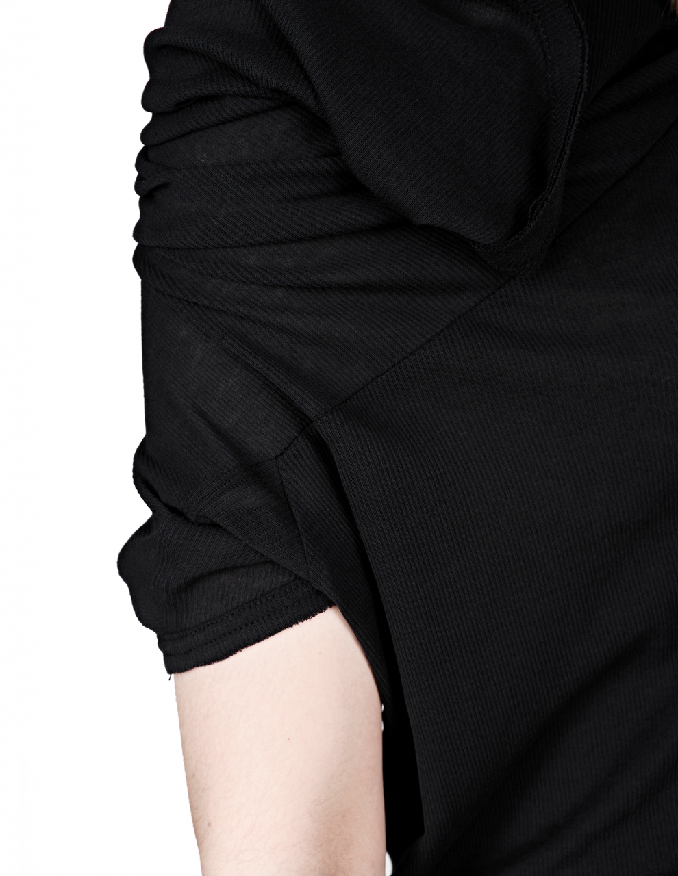 Женская ассиметричная футболка с драпировкой черного цвета из ограниченной коллекции DICHOTOMY, изготовлена из перекрученной драфы