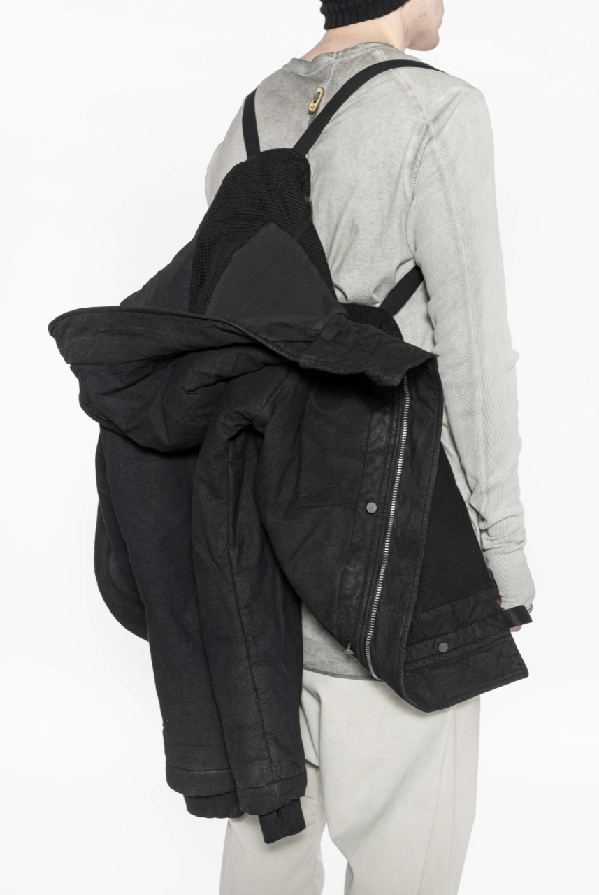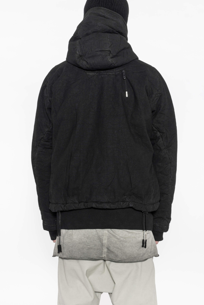DESCRIPTION Vinyl coated short padded parka with hood crafted in cotton and nickel pressed. Two-way zipper closure at center front. Front placket with oxidized metal button closure. One internal and two external zipped pockets. Shoulder strap and drawstring at hem. Reinforced thumbholes on ribbed sleeve cuffs. Signature Boris Bidjan Saberi tag with detail in Sterling Silver 925 - 3 gr. PrimaLoft Insulation Gold 200gr padding. Fabric: F1502F-W. Material: 100% cotton. Treatments: Waxed, Vinyl Coated, Nickel Pressed. Permanent Classic Conyinuous. Handcrafted in Spain.