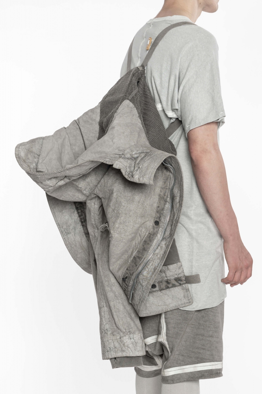 Двухсторонняя молния по центру, передняя планка с застежкой на пуговицы из окисленного металла. Один внутренний и два внешних кармана на молнии; плечевой ремень и кулиска по низу. Усиленные отверстия для большого пальца на ребристых манжетах рукавов. Фирменная бирка BORIS BIDJAN SABERI с деталью из серебра 925 пробы - 3 гр.