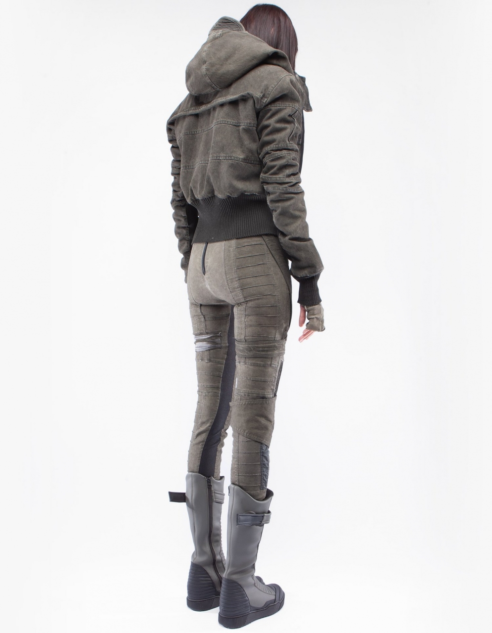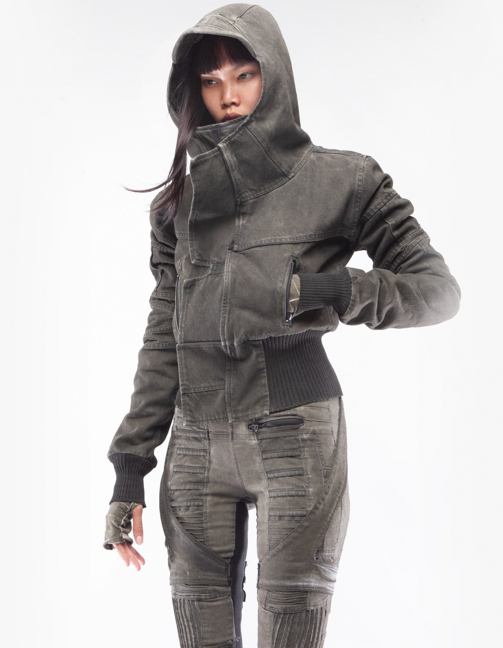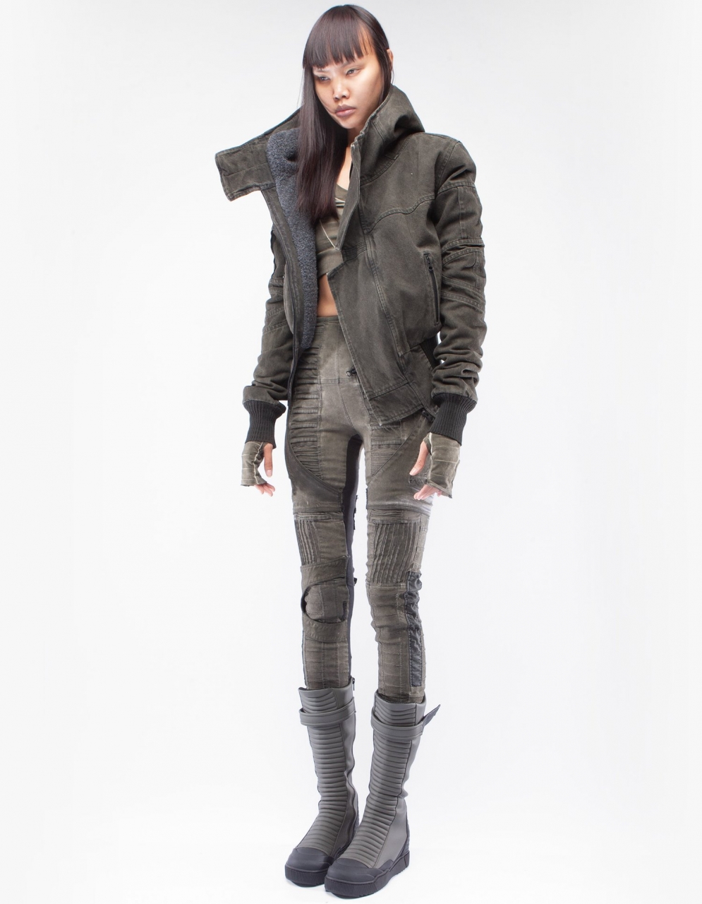 detailed hooded denim bomber jacket with winter lining closing by zipper, zipped pockets vintage washed effect