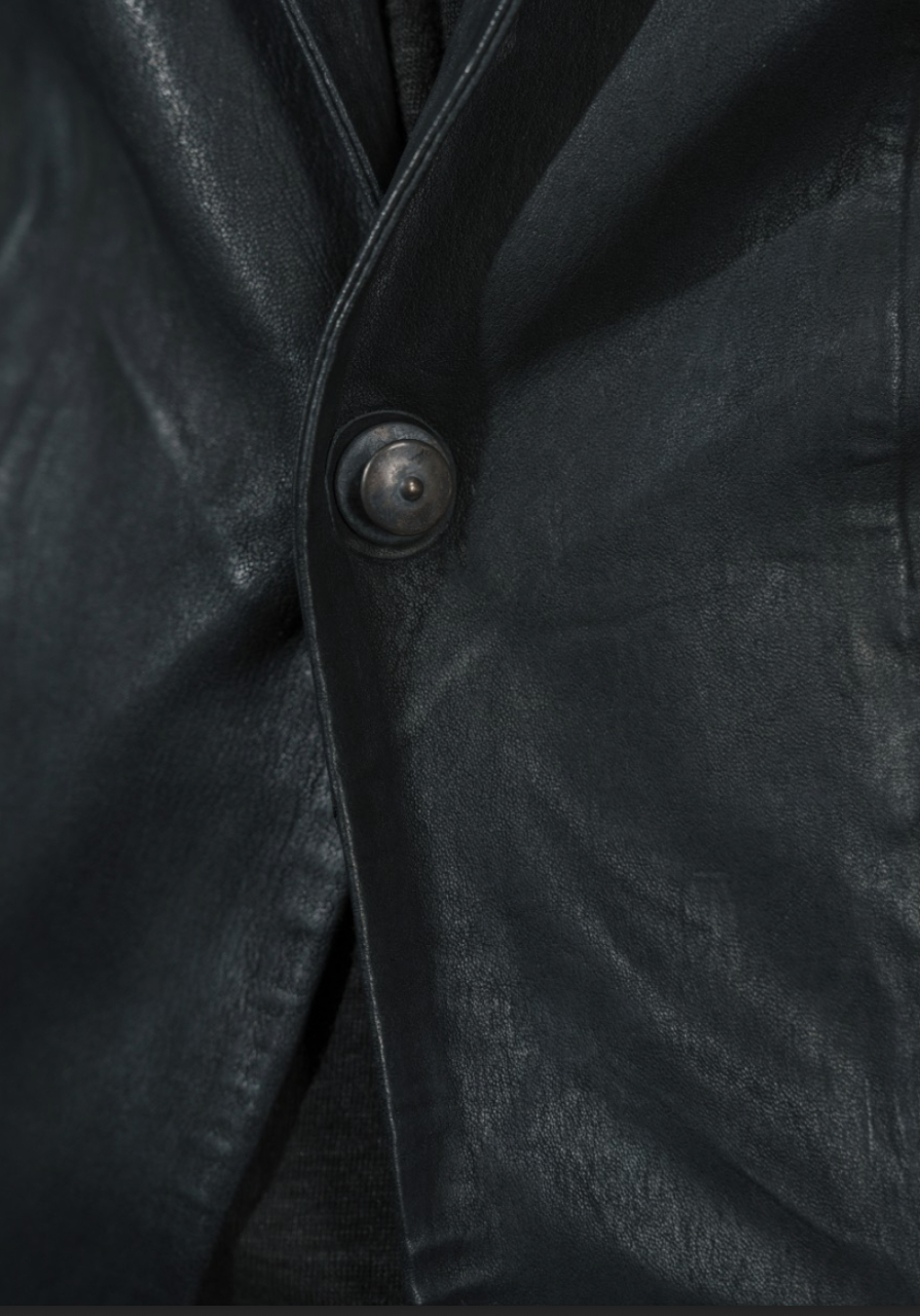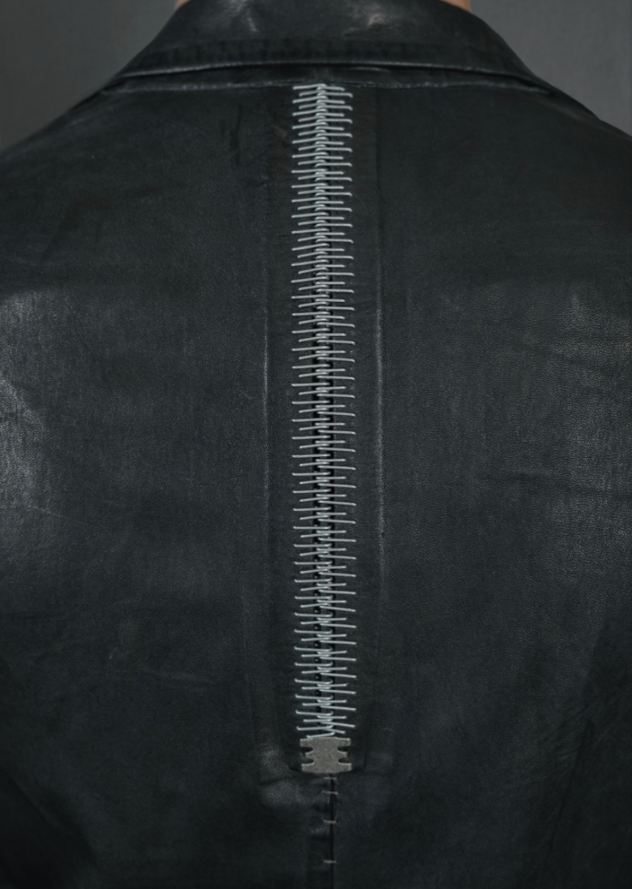PIONNIER STRETCH LEATHER CLASSIC BLAZER THERMOADHESIVE TAPE INSIDE SPECIAL FASTENERS AT FRONT AND CUFFS ISAAC SELLAM SPINE SIGNATURE AT THE BACK GARMENT WASHED AND MOULDED ON BODY