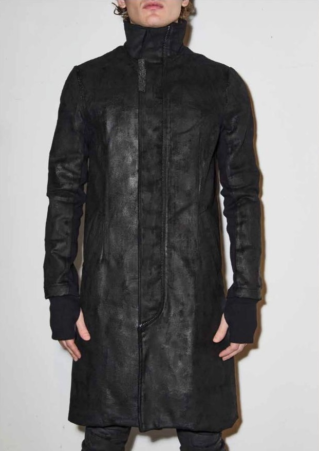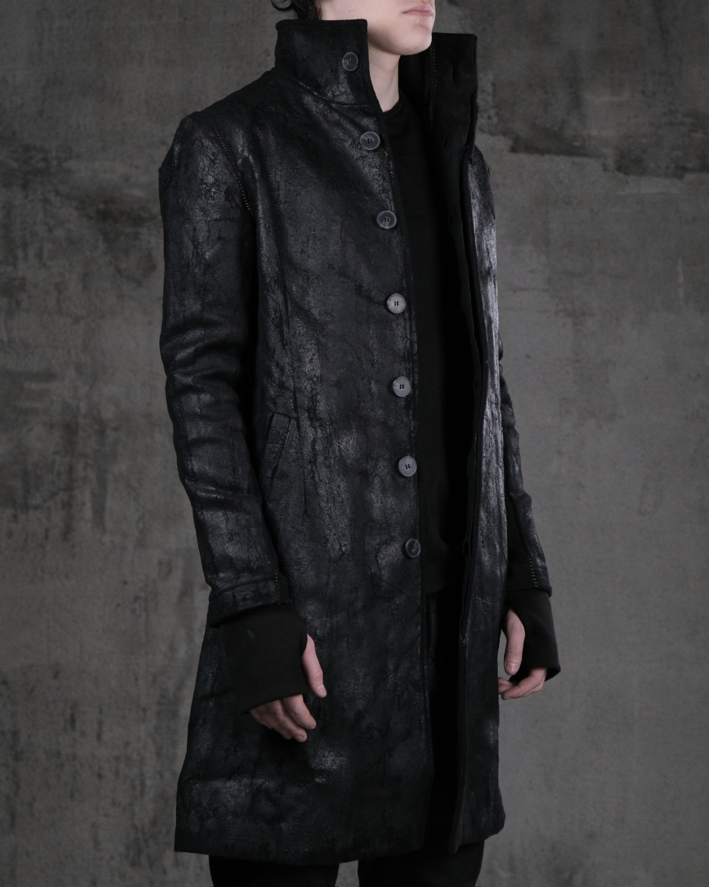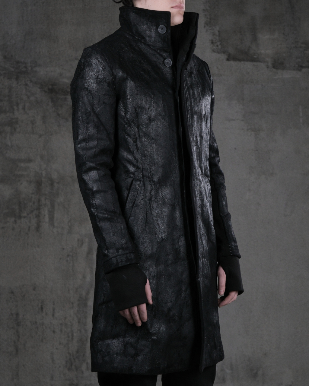 Мужское длинное пальто с высоким воротником из тканого шерстяно-кашемирового полотна с ручной росписью полиуретановыми мазками и на пуговицах.
