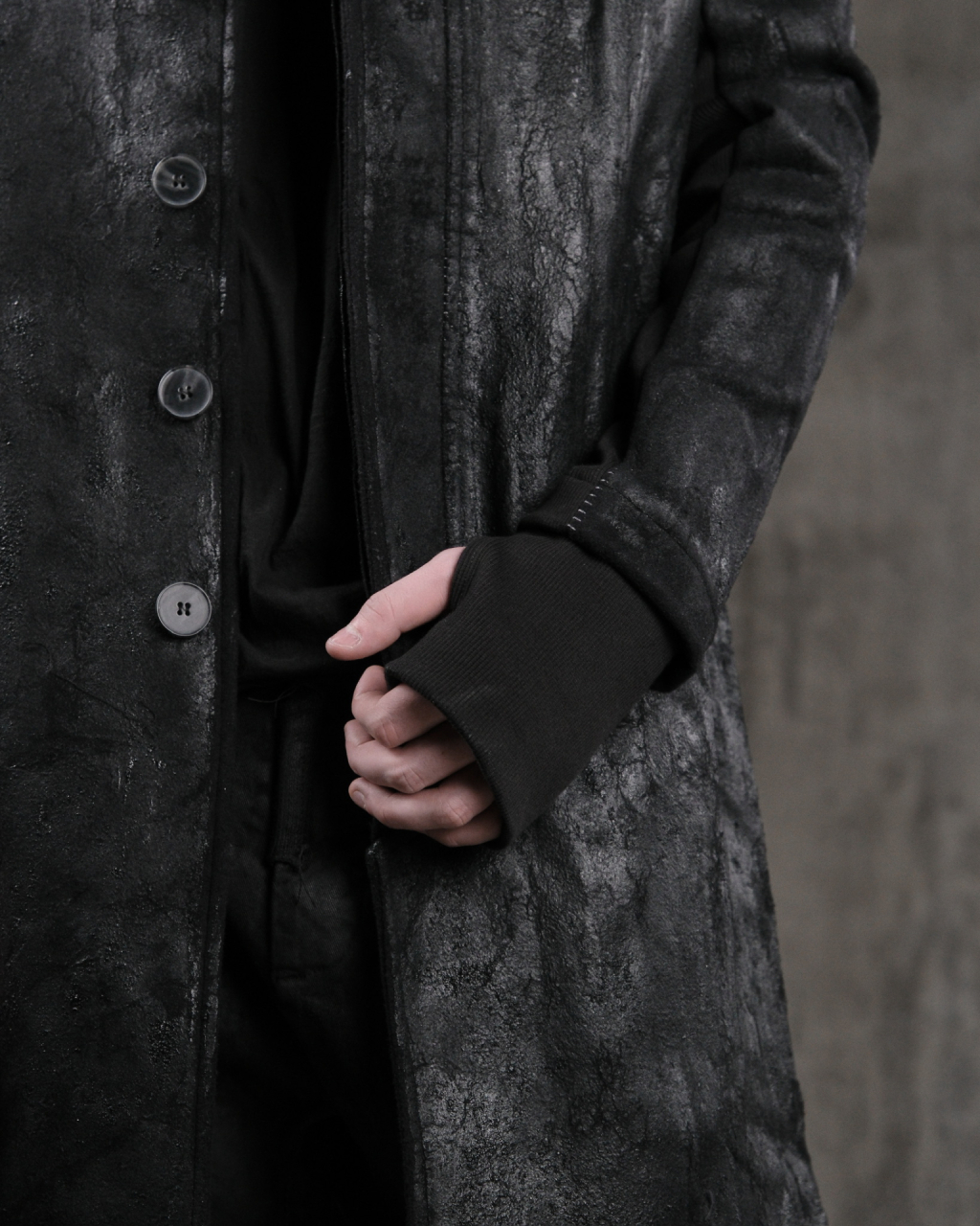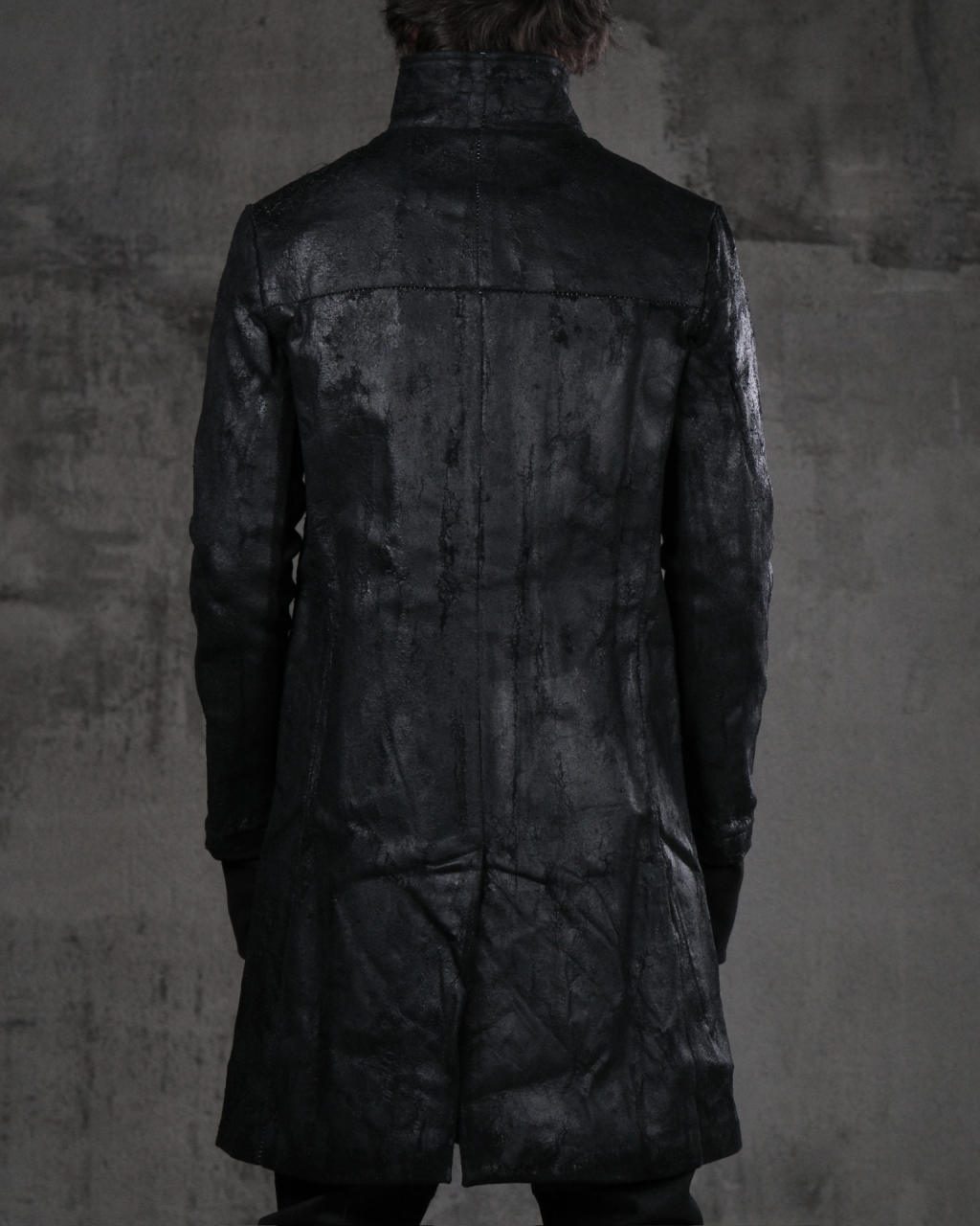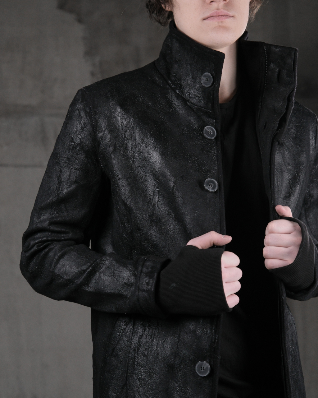 Мужское длинное пальто с высоким воротником из тканого шерстяно-кашемирового полотна с ручной росписью полиуретановыми мазками и на пуговицах.