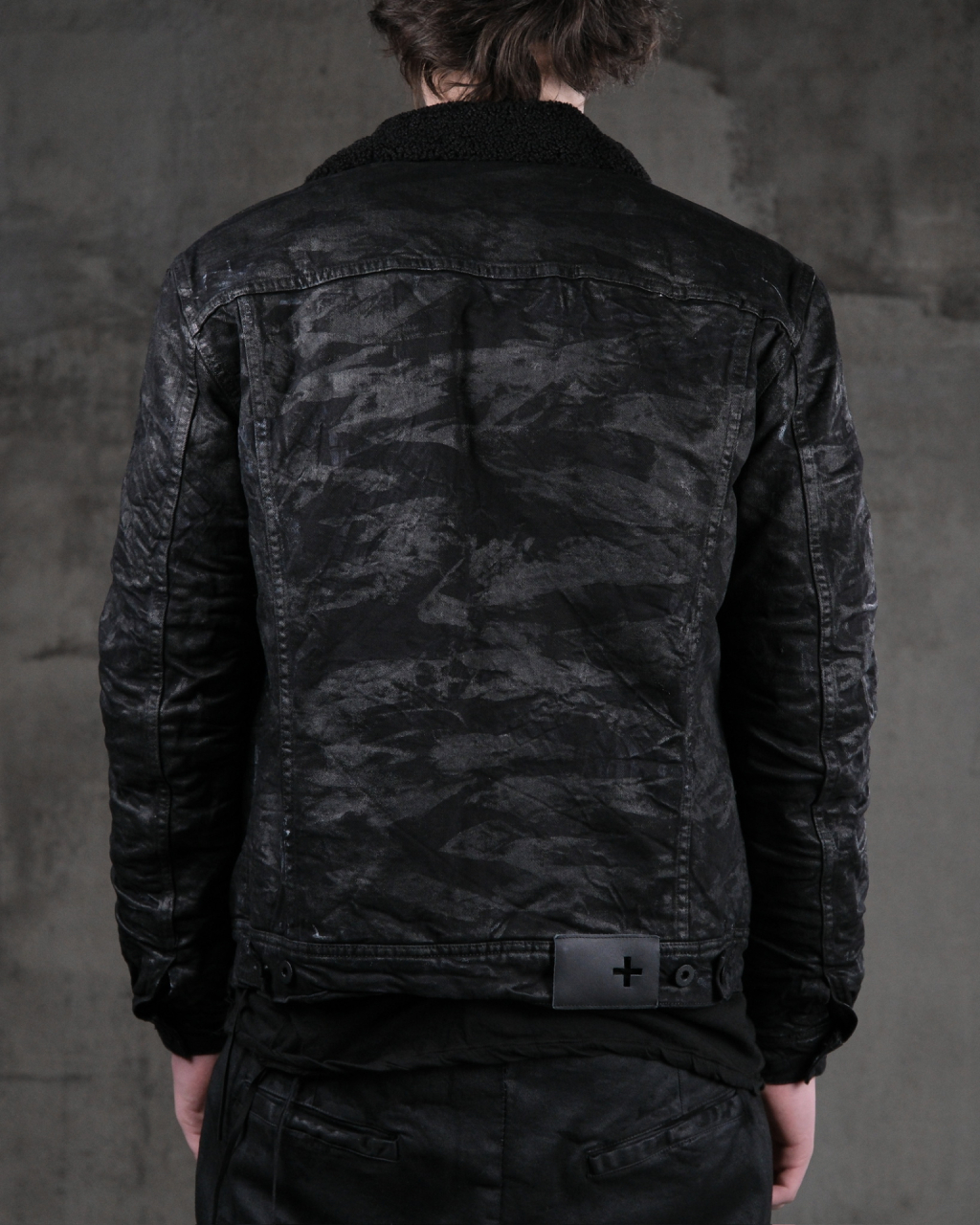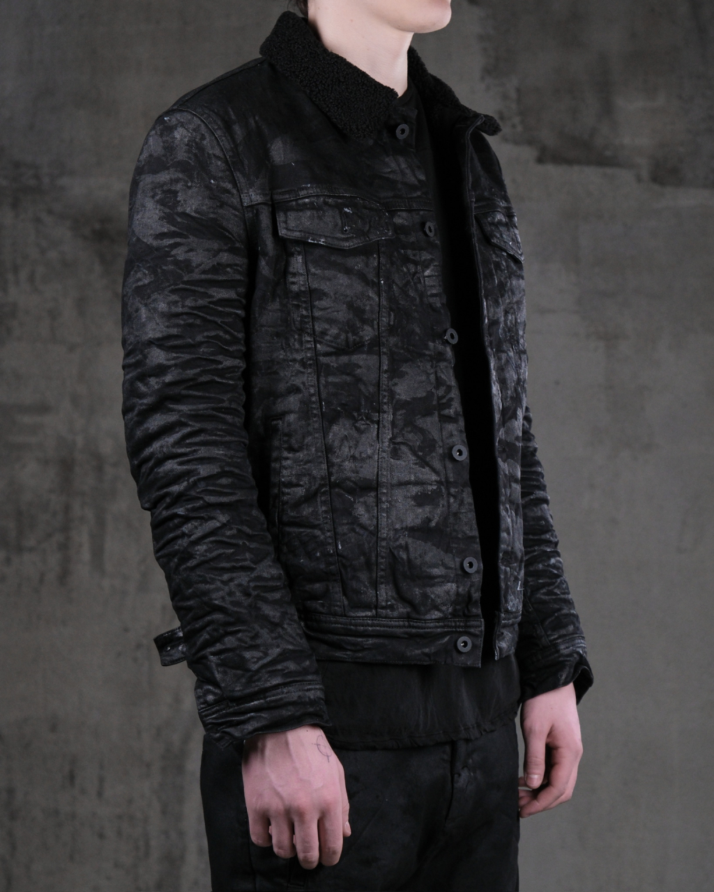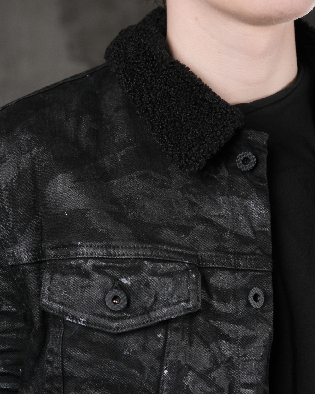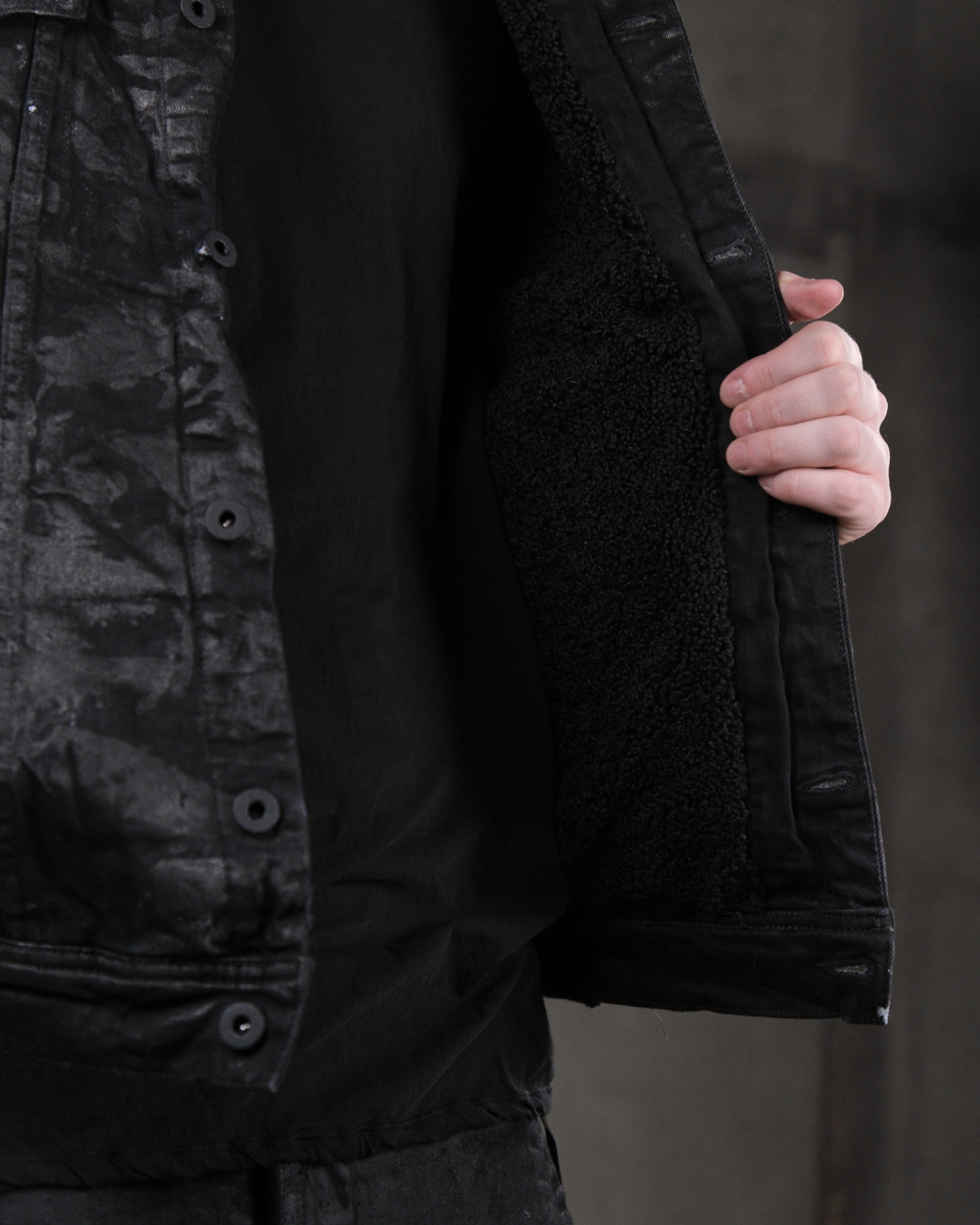 Джинсовая куртка из выстиранного черного эластичного денима.