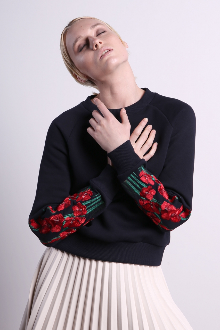 Женский свитшот из плотной фельпы с начесом темно-синего цвета с вышивкой на рукавах (гладиолус). Состав: 80% хлопок, 20% полиэстер.
