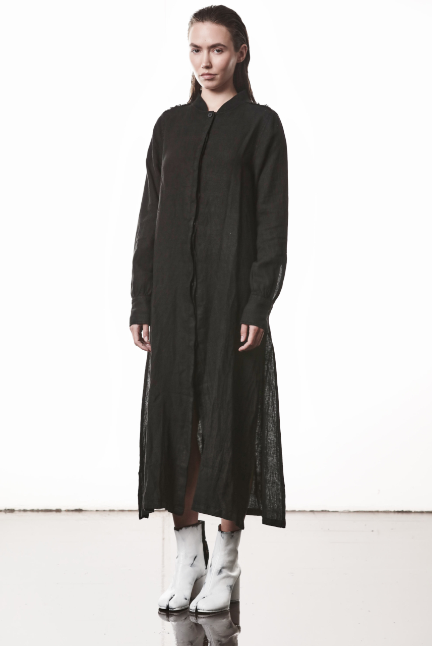 Длинное льяняное платье свободного кроя с разрезами по бока и засетжкой на потайные пуговицы, воротник из хлопка в рубчик, необработанные края, манжеты на рукавах.