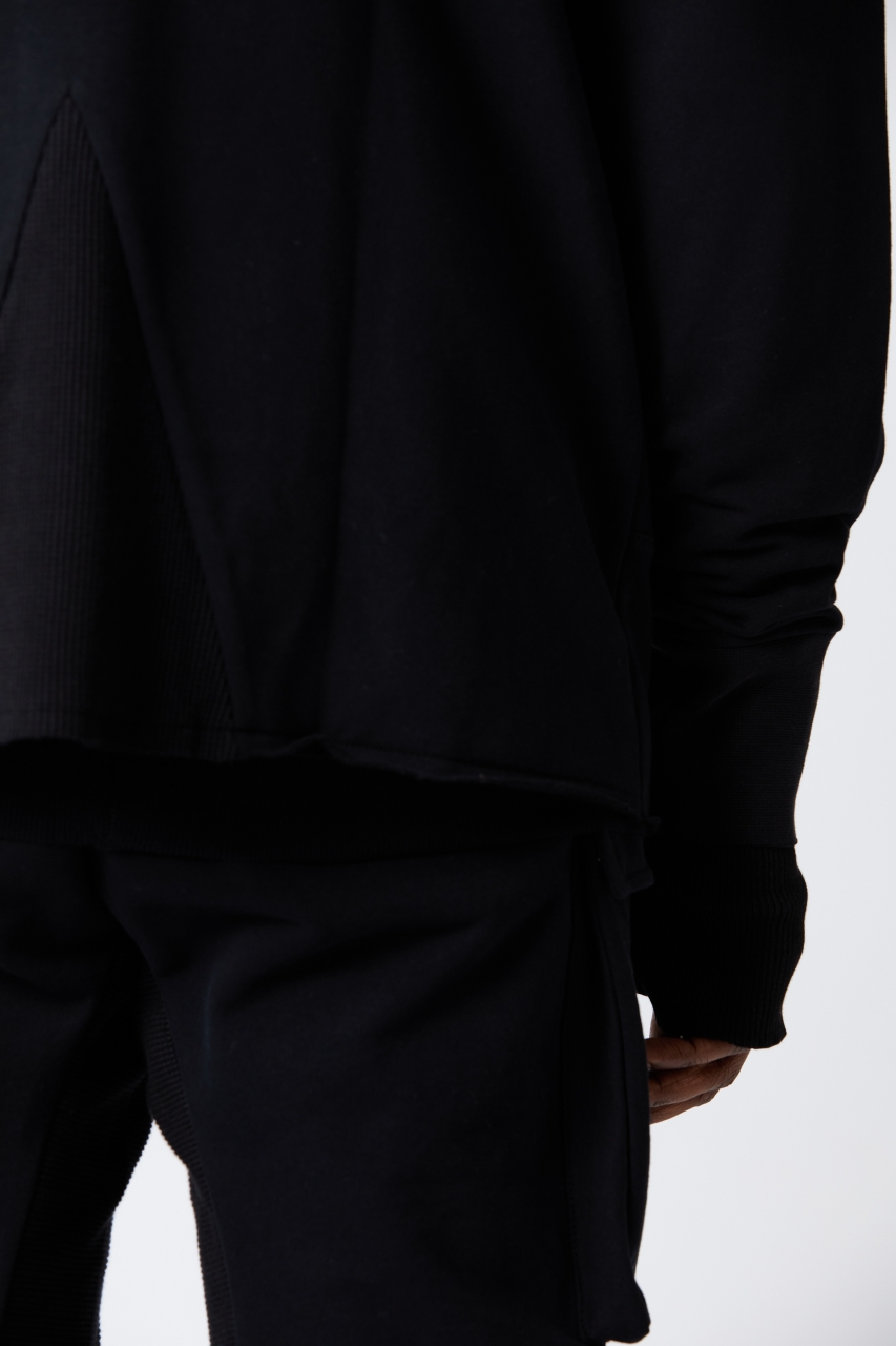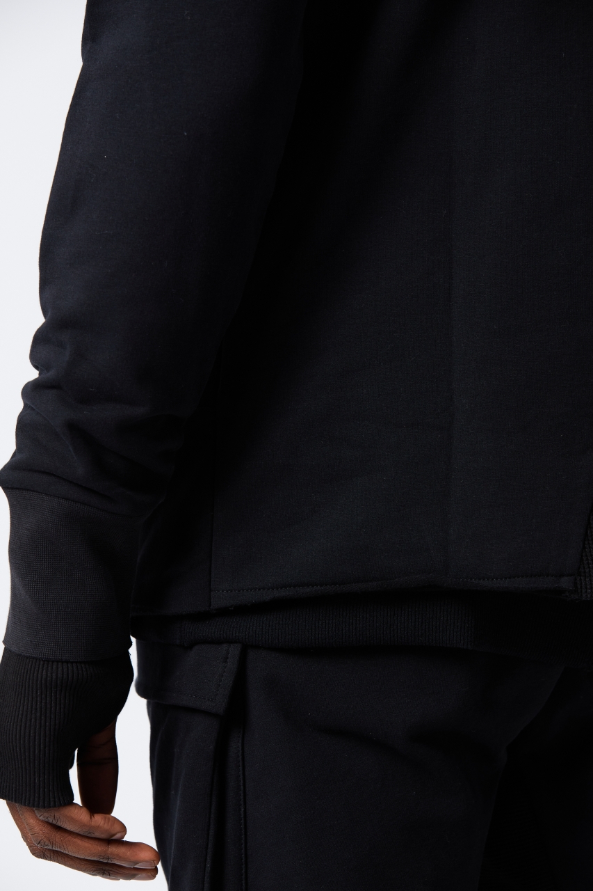 hoodie jacket slim fit double cuffs at sleeves thumbholes material mix long welt front pockets 2-way-zip closure scar stitching details