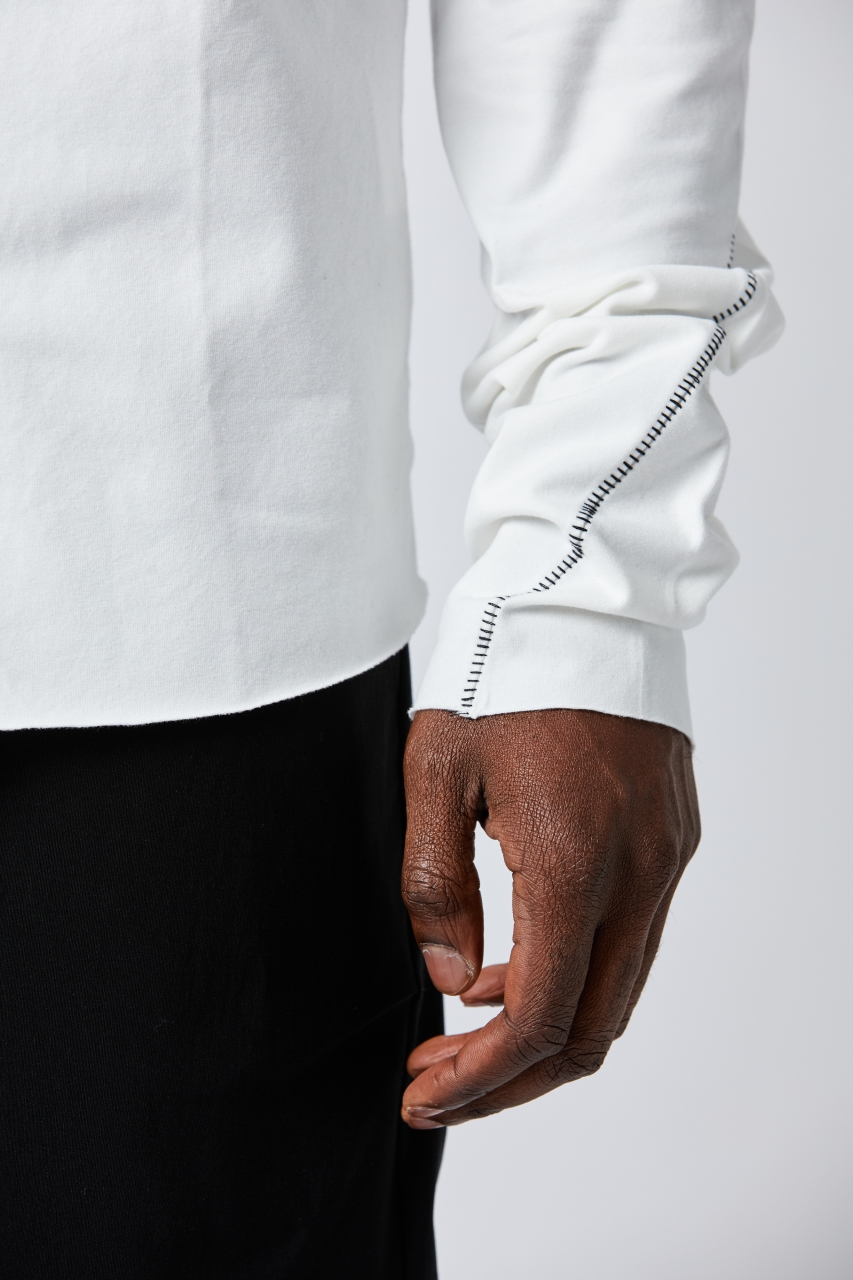 stand-up collar shirt slim fit hidden button fly all jersey material scar stiches details raw cut