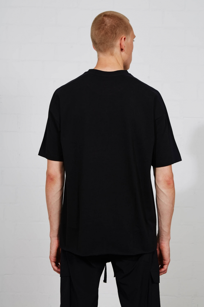 round neck oversized fit short sleeves raw cut hem woven nylon insert at shoulders nylon insert in contrast