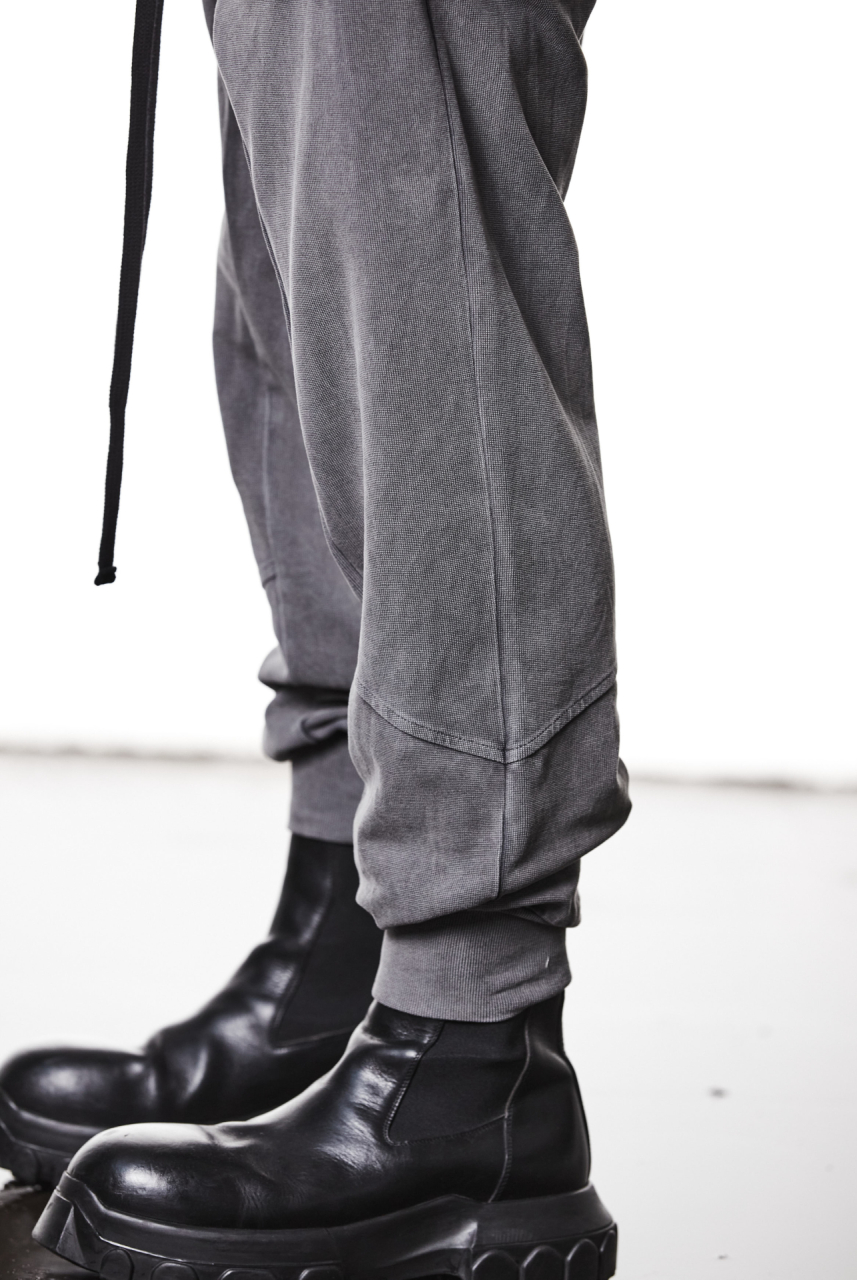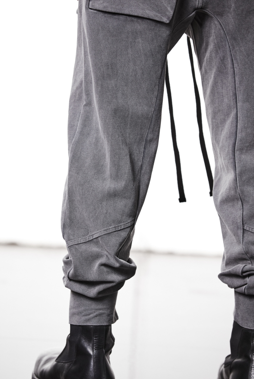 drop crotch trousers cargo zip pockets dart details at leg safety inside pocket structured elastic cotton mix fabric