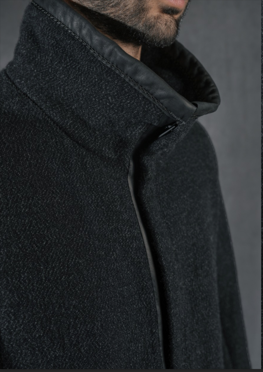 HIGH NECK COAT TWO-WAY ZIPPER AT FRONT TAPED WITH LEATHER ZIPPED PATCH POCKETS AT SIDES FINISHED WITH RUBBER SHEATHS SPECIAL FASTENERS AT SLEEVES SEAMS WITH A WIDE OVERLOCK LEATHER PIPING WITH BIG CHAIN POINT AT COLLAR , SLEEVES AND BOTTOM LONG LEATHER SPINE WITH SIGNATURE STAPLE 69 BY ISAACSELLAM ON BACK