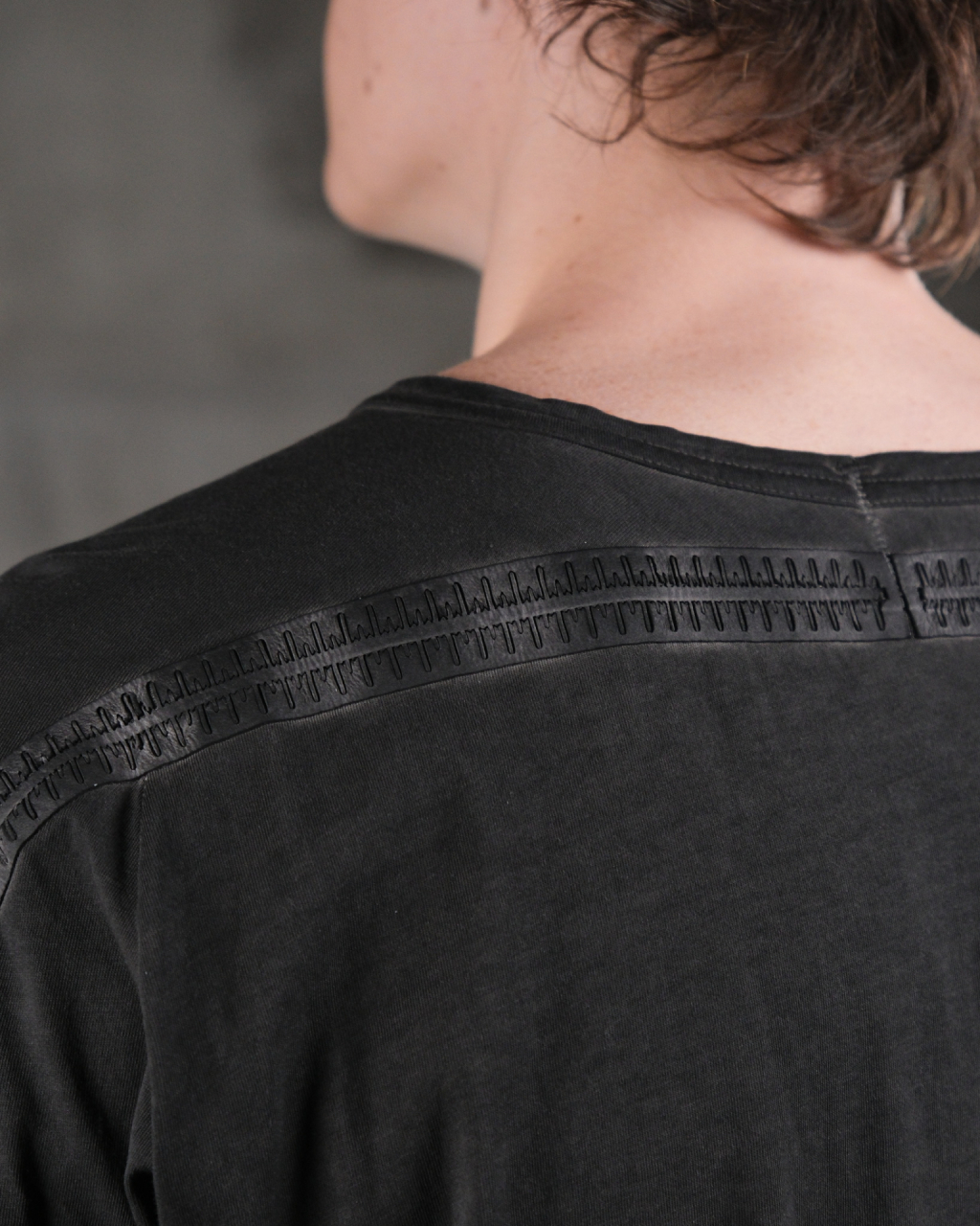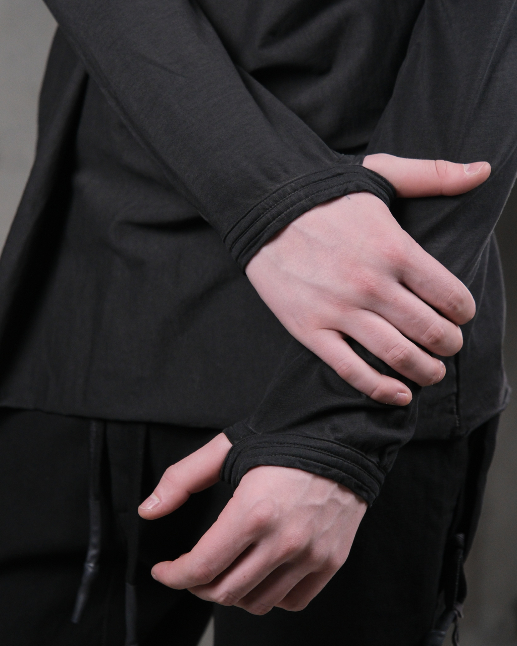 Лонгслив из хлопкового джерси. Модель свободного кроя, удлиненные рукава с прорезями для больших пальцев, круглый ворот, на спине кожаные тейпы с фирменной металлической пластиной.