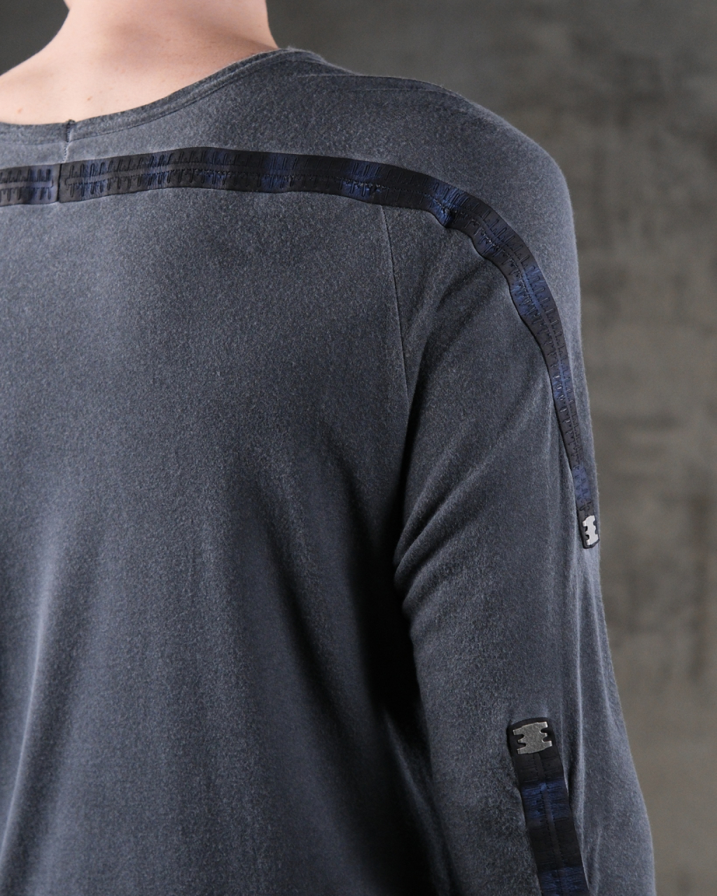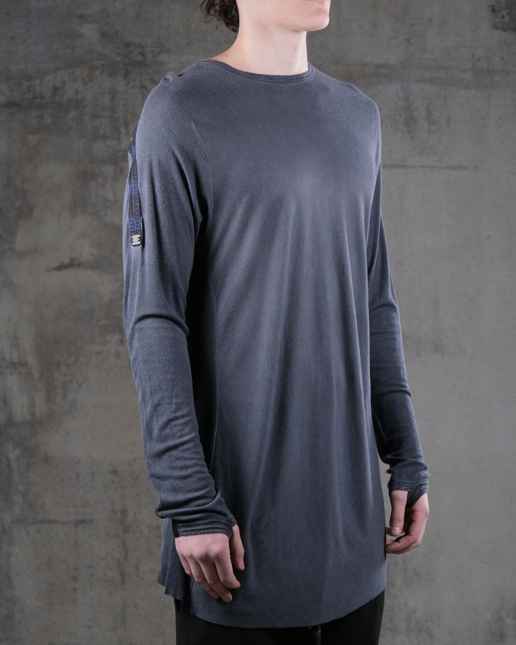Лонгсилв из шелковистого джерси с кашемиром в составе. Модель свободного кроя с удиленными рукавами и прорезью для большого пальца. Круглый ворот с отделкой, на спине кожаный тейп с металлической фирменной пластиной.