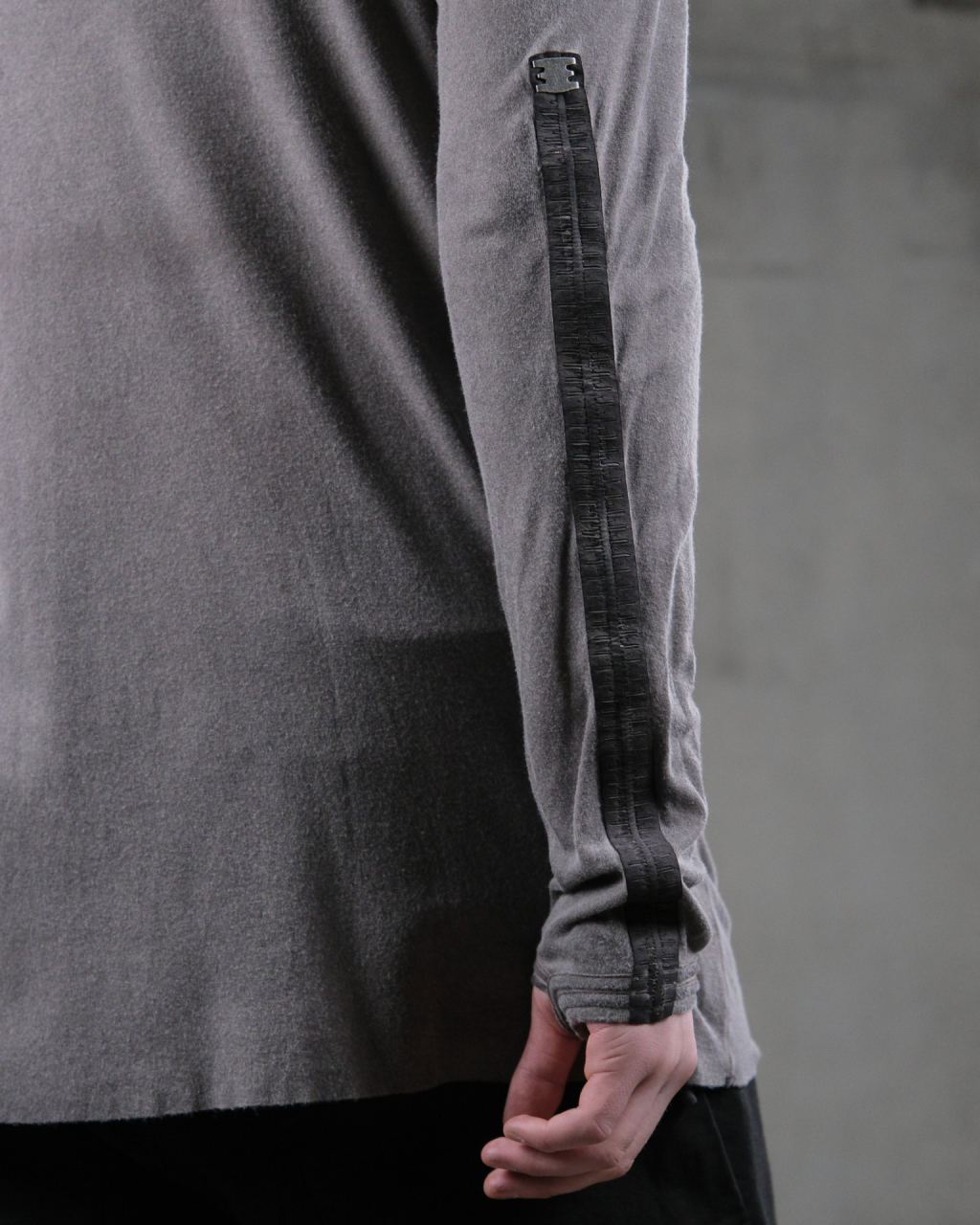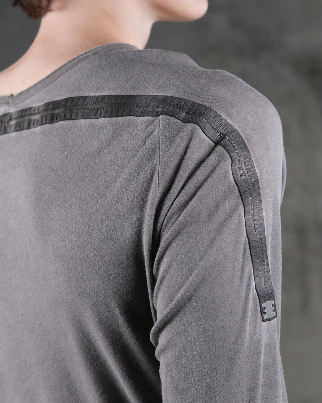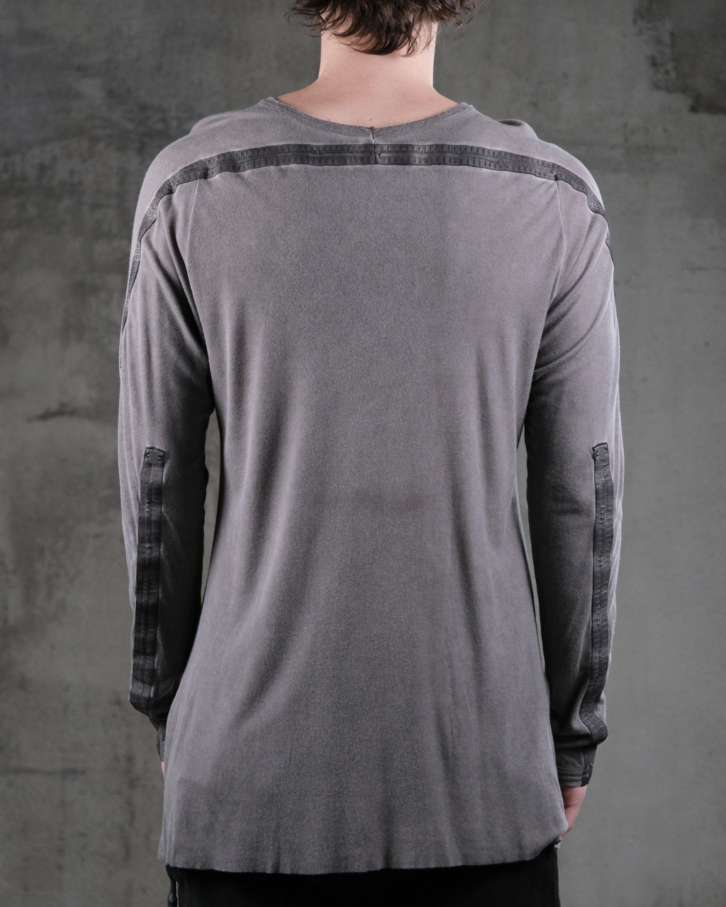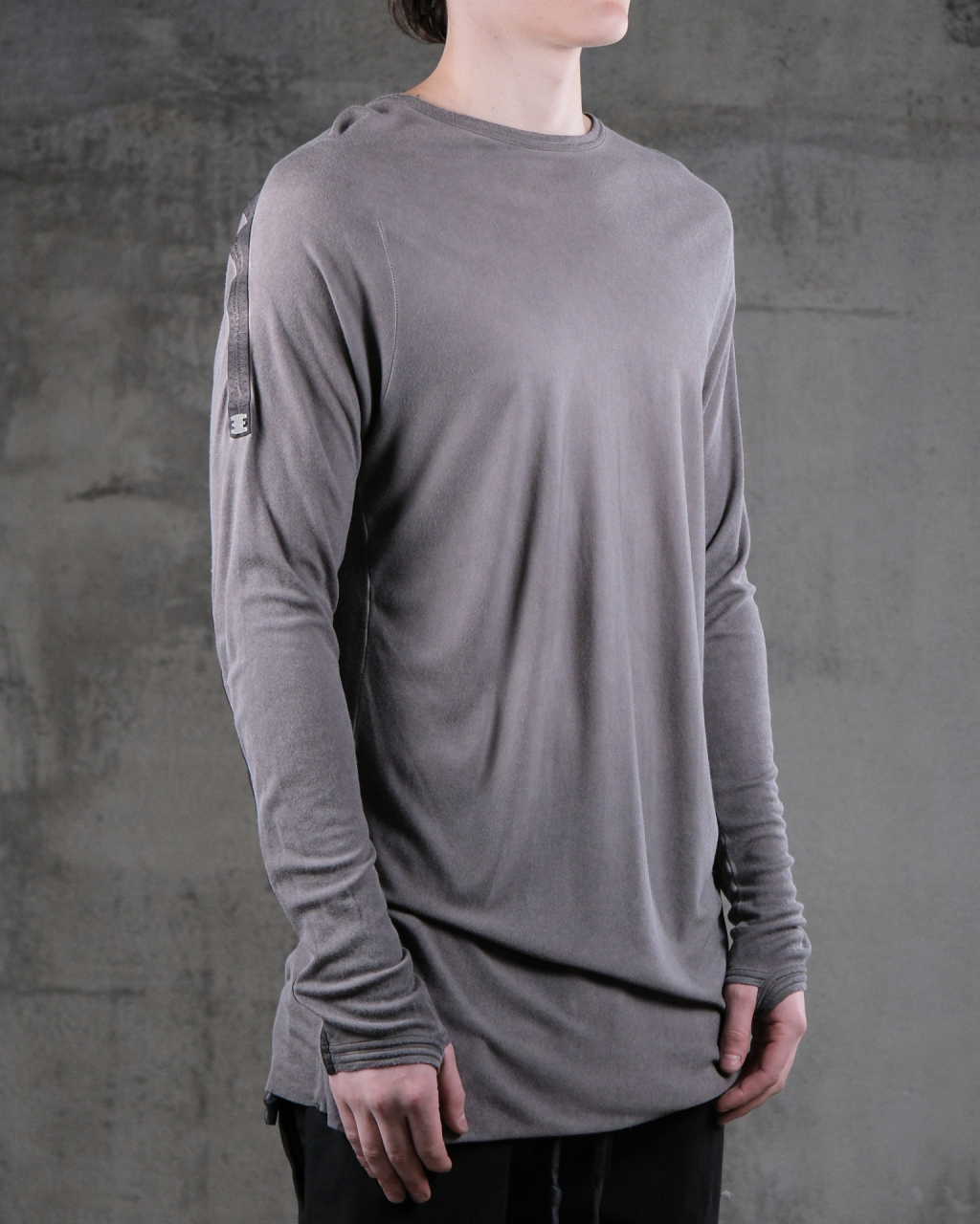 Лонгслив из хлопкового джерси. Модель свободного кроя, удлиненные рукава с прорезями для больших пальцев, круглый ворот, на спине кожаный тейп с фирменной металлической пластиной.