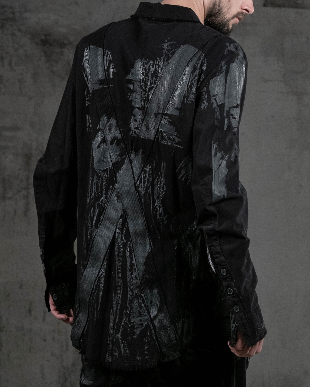 Band details in back forming a X and running over the shoulders to the front.