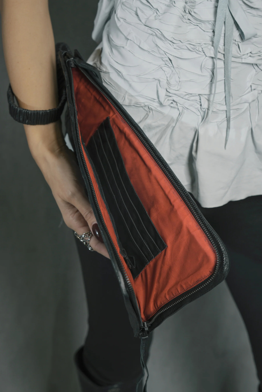 Удлиненный клатч, двойная застежка молния, один внутренний карман на молнии, 6 отделений для карт, эластичный кожаный ремешок, низ сумки с фиксатором. Фирменные скобы ISAAC SELLAM