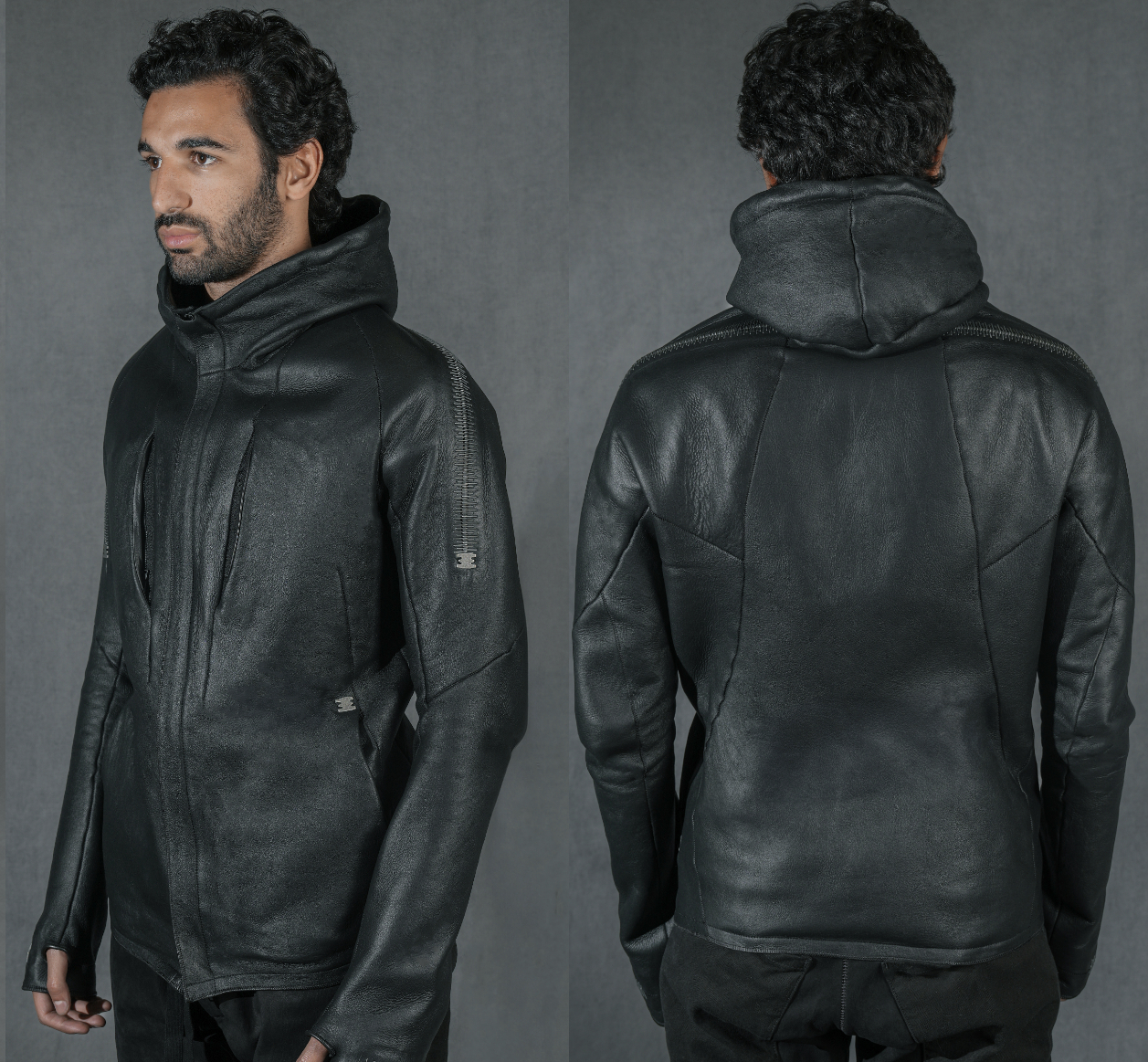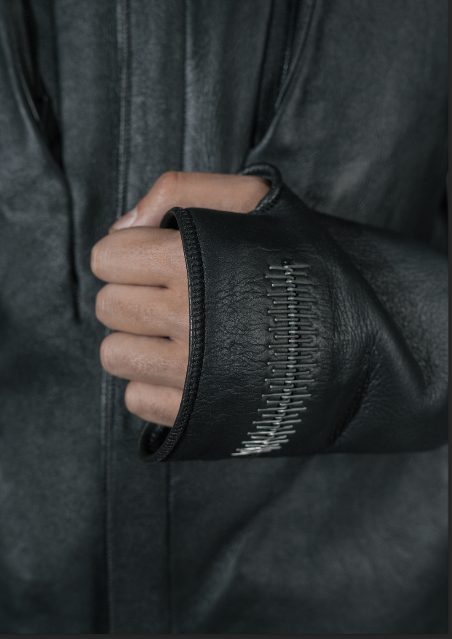 HOODY JACKET TWO-WAY ZIPPER AT FRONT ZIPPED POCKETS AT BREAST STAPLES AT SIDES POCKETS THERMOADHESIVE LEATHER TAPE HORIZONTAL SPINE FROM THE BACK TO THE SLEEVES CUFFS FINISHED WITH THUMBS AND SPINE AT PHALANGE GARMENT WASHED AND MOULDED ON BODY