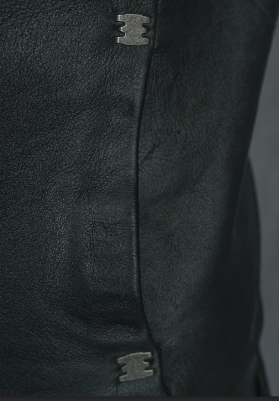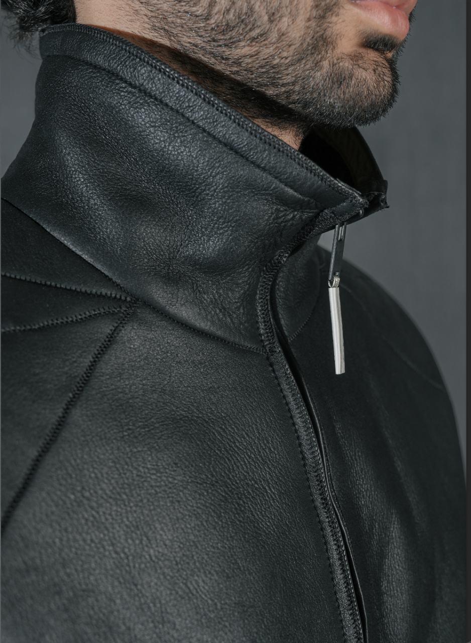 Куртка с высоким воротником, имитирующая мышцы человека, отстрочка по всей поверхности, двусторонняя молния спереди, спинка сзади и карманы со скобами, фирменная отделка ISAAC SELLAM