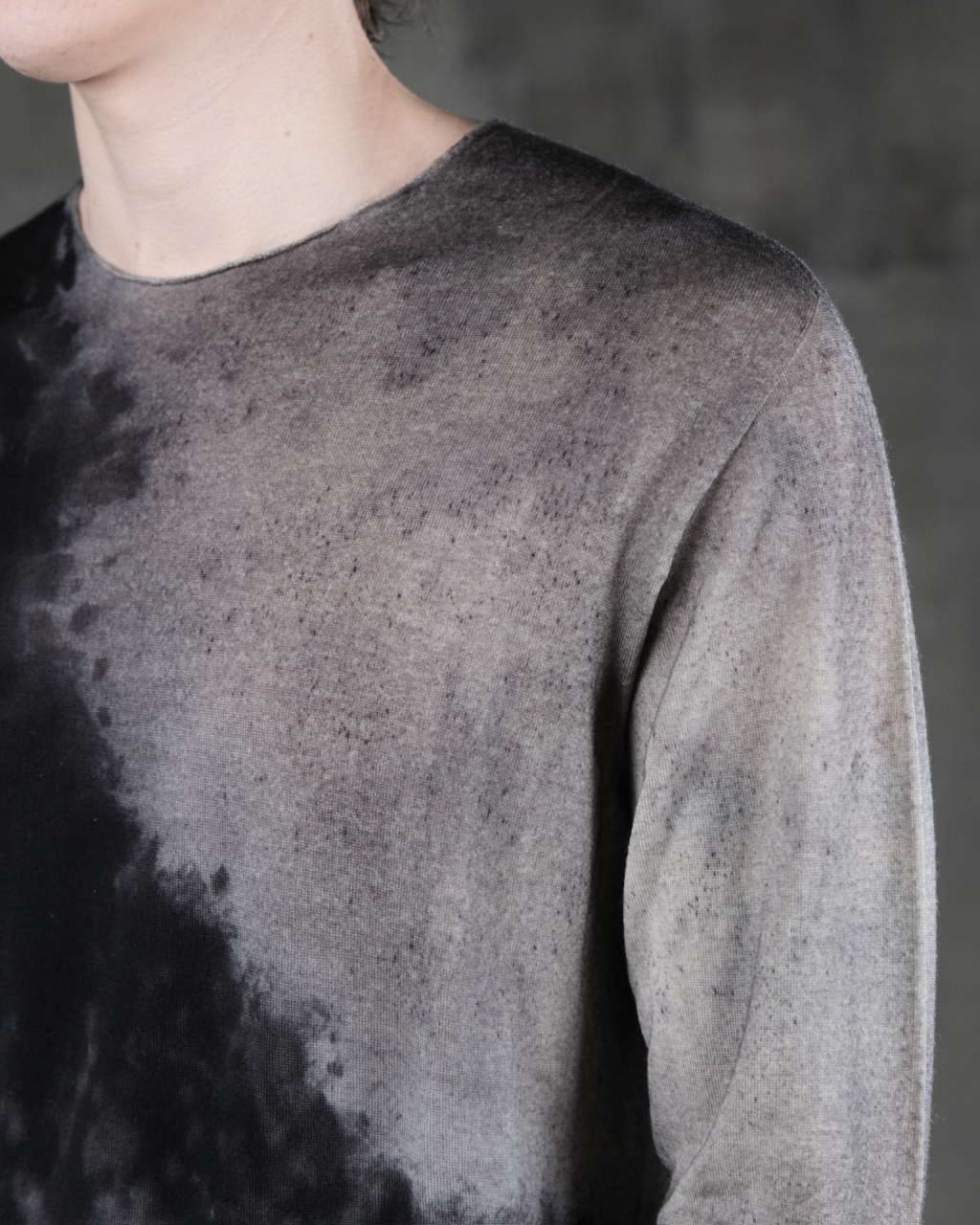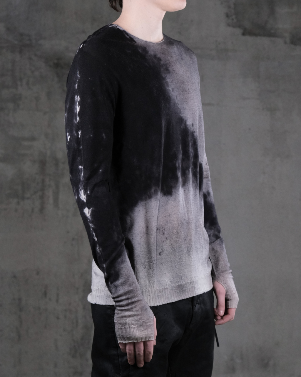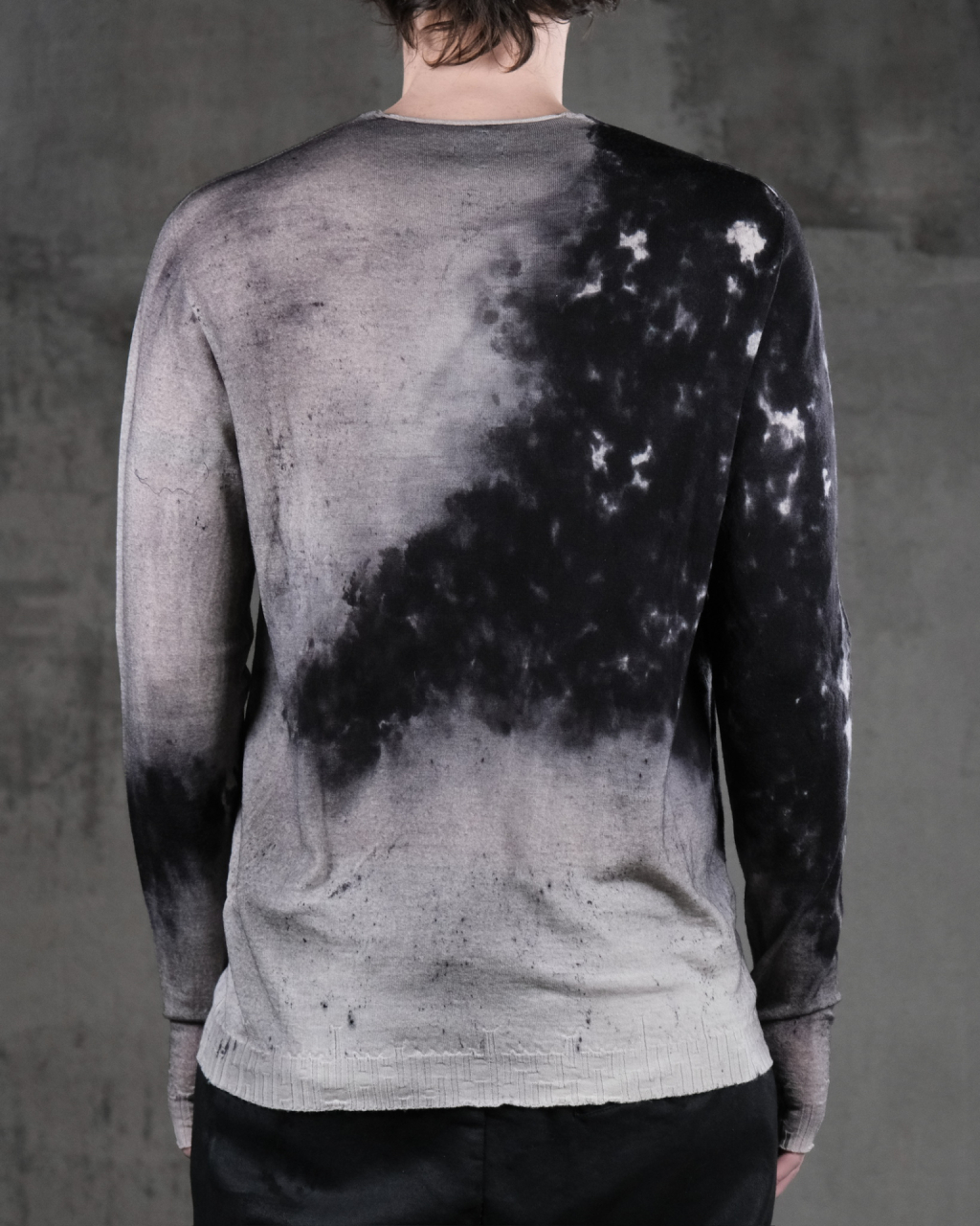 Мужской легкий шерстяной трикотажный свитер черно-белогоо цвета с эффектом "плесени", полученным методом ручного окрашивания распылением.