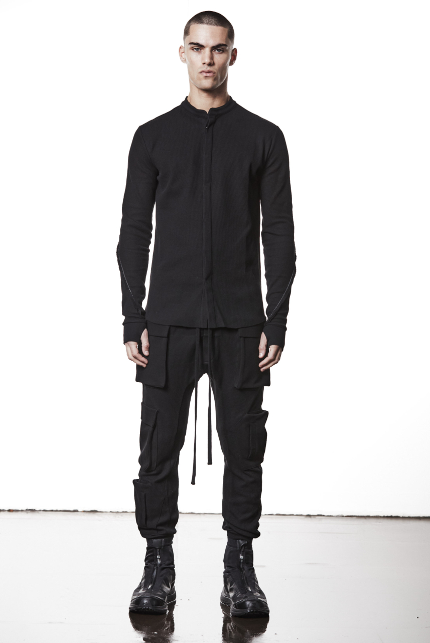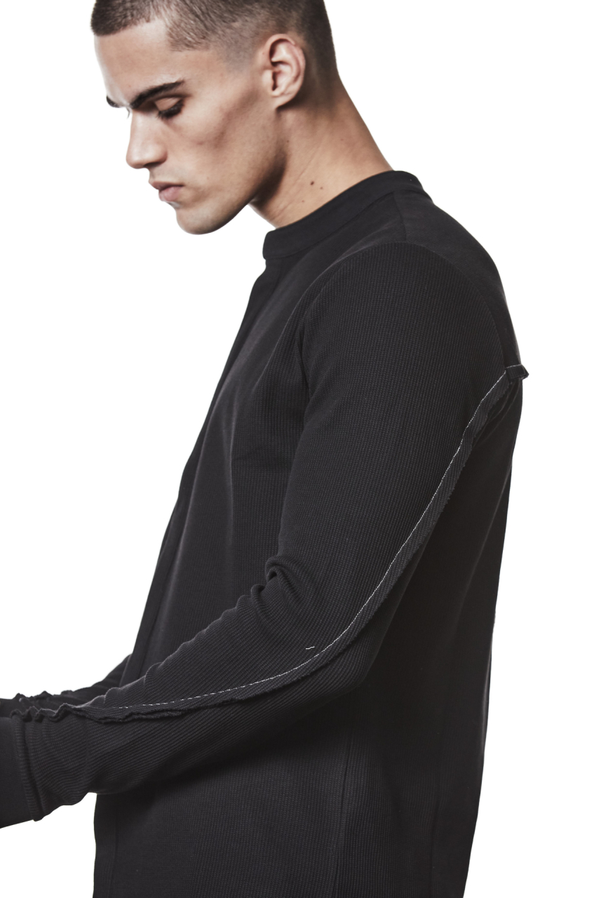 stand up collar shirt relaxed fit long sleeves with rib cuffs and thumbholes cutted seams outside with contrast design stitchings raw cut hem and cuffs structured soft jersey material