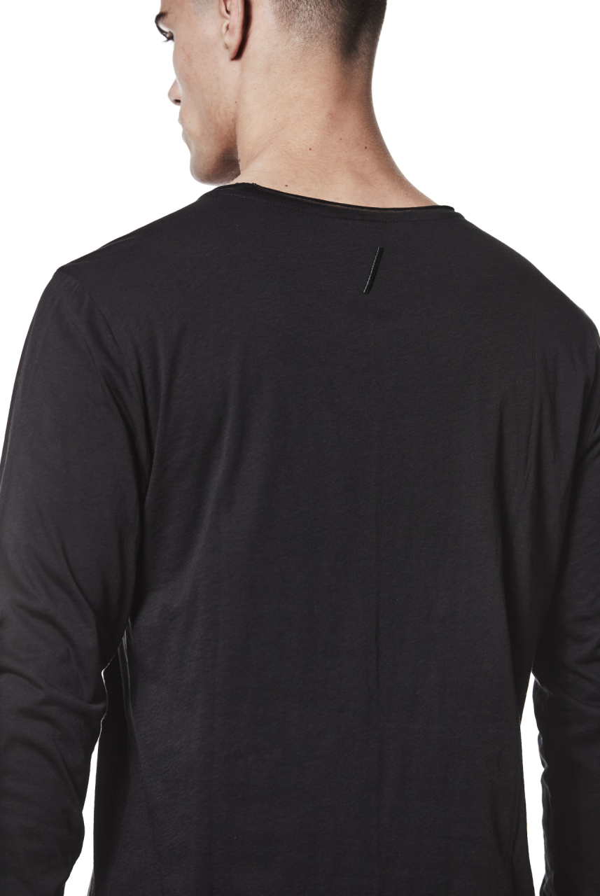 round neck shirt slim fit 2 in 1 layer look (body and sleeves) collar with open edges raw cut hem embroidered slash detail rounded hem light jersey quality