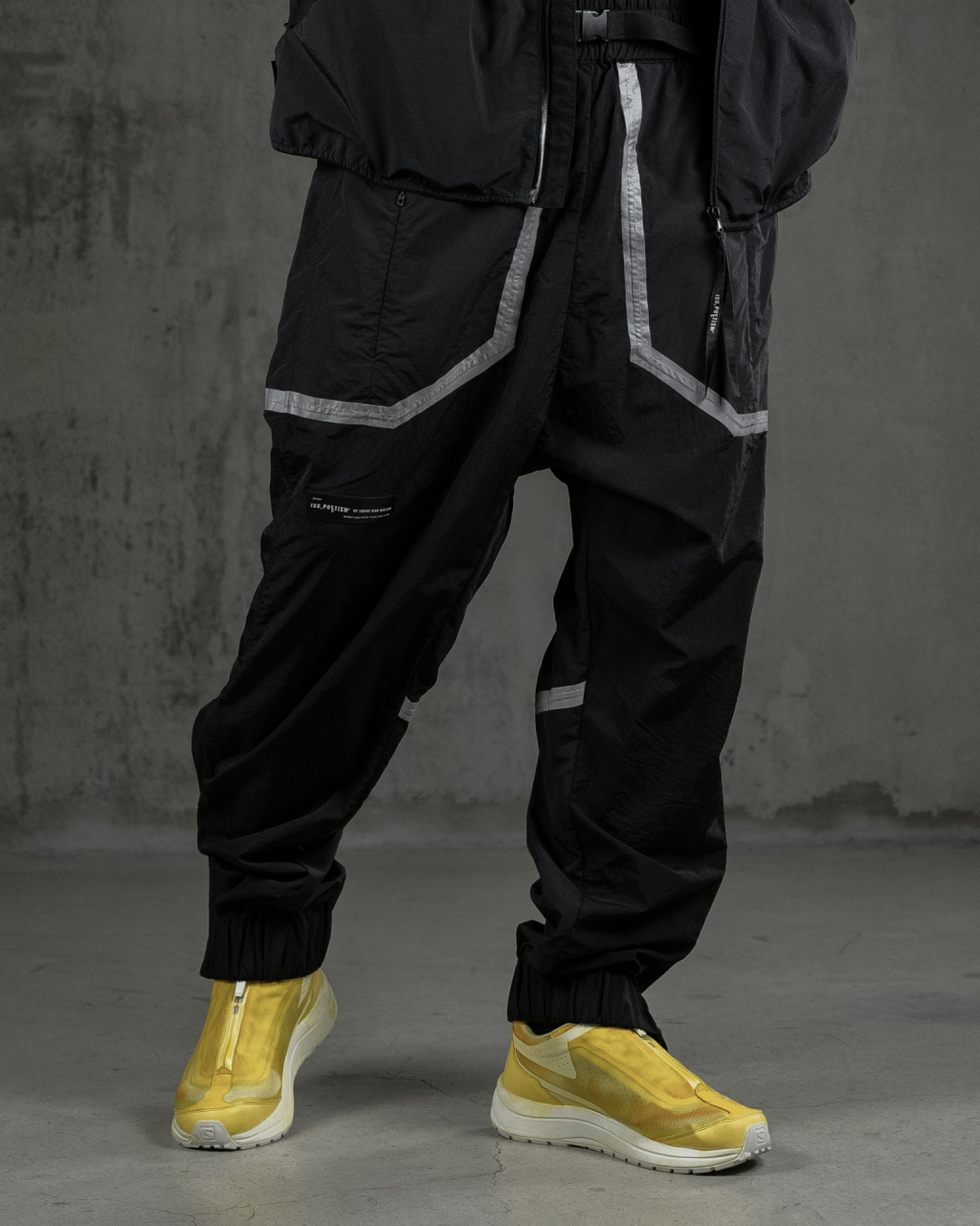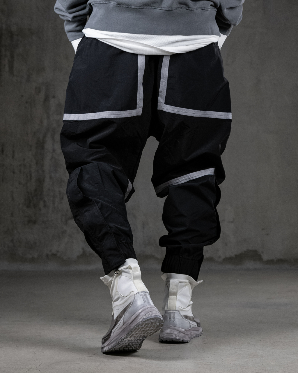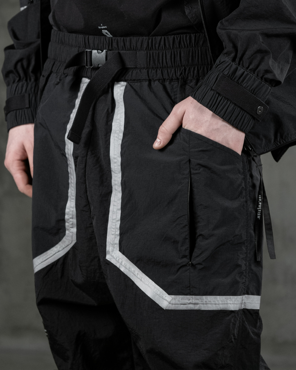 Свободные брюки с боковыми отверстиями на молнии, тайский борцовый пояс, брезентовая лента и пряжка, передние карманы с закрепками, скрытый карман на молнии в центре передних карманов, заниженный шаговый шов и изонутая линия ноги, термотейпы поверх правого бедра, изогнутое боковое отверстие с застежкой молнией, дизайн термотейпов по всему стилю, один задний карман с закрепами, эластичные манжеты.