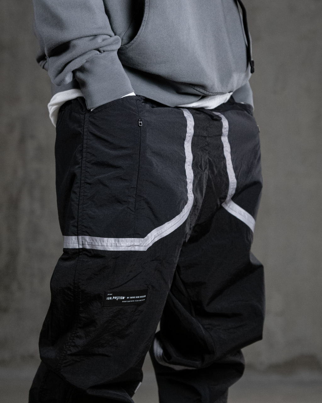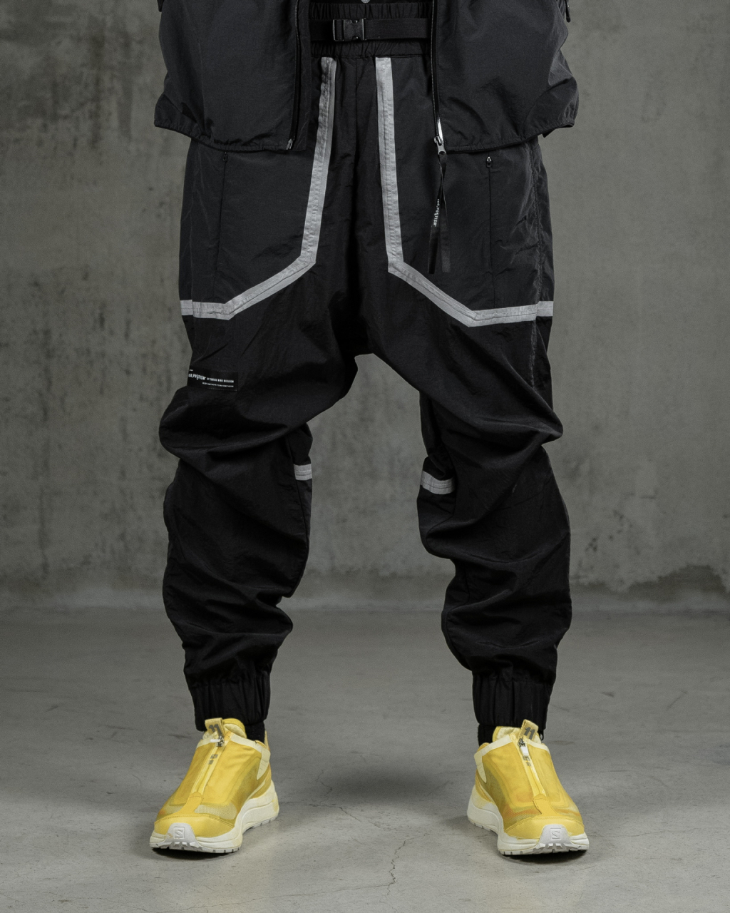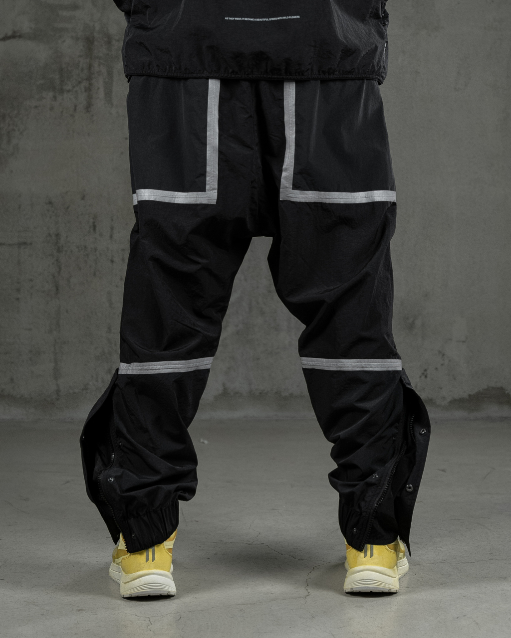 Свободные брюки с боковыми отверстиями на молнии, тайский борцовый пояс, брезентовая лента и пряжка, передние карманы с закрепками, скрытый карман на молнии в центре передних карманов, заниженный шаговый шов и изонутая линия ноги, термотейпы поверх правого бедра, изогнутое боковое отверстие с застежкой молнией, дизайн термотейпов по всему стилю, один задний карман с закрепами, эластичные манжеты.
